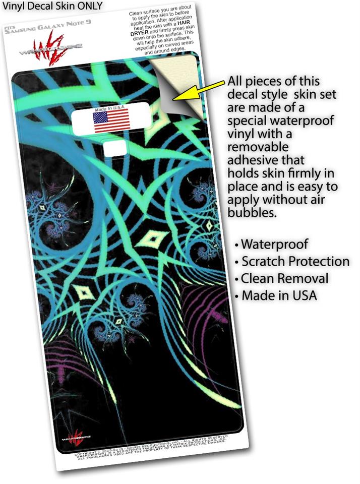 • Decal style vinyl skin covers back and part of the sides of Samsung Galaxy Note 9 - Not a hard case - Fits well with most Clear and TPU cases.