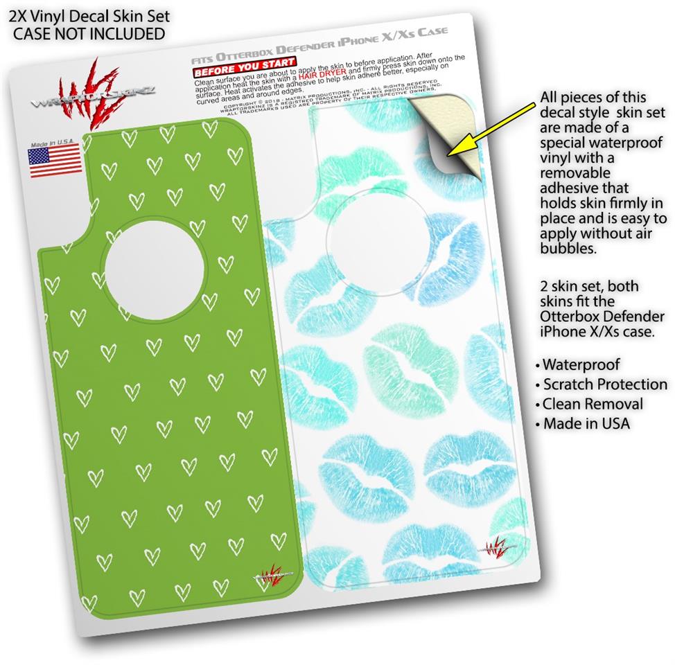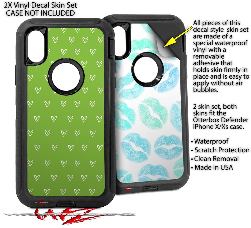 2x Decal style Skin Wrap Set compatible with Otterbox Defender iPhone X and Xs Case - Hearts Green On White (CASE NOT INCLUDED)