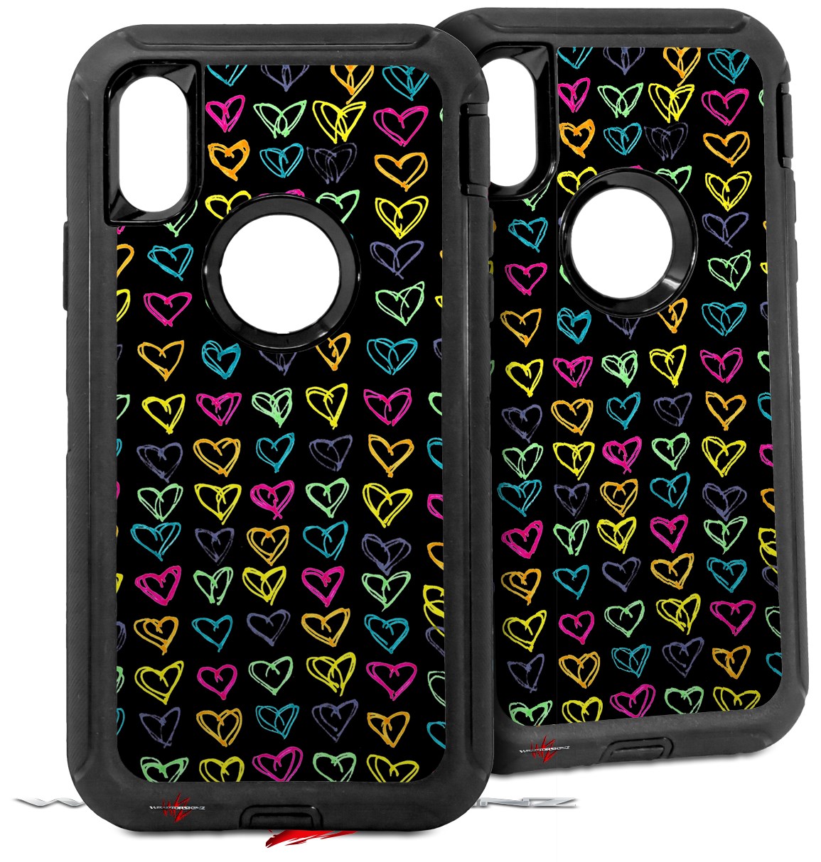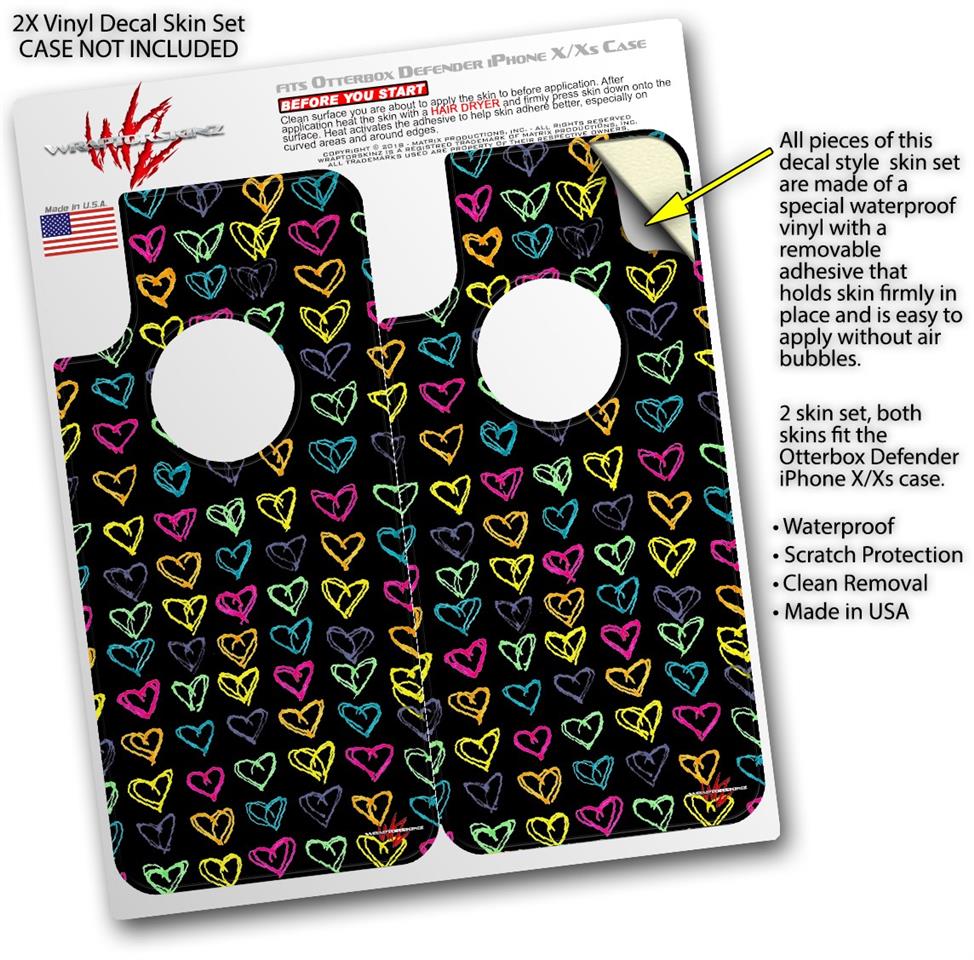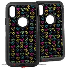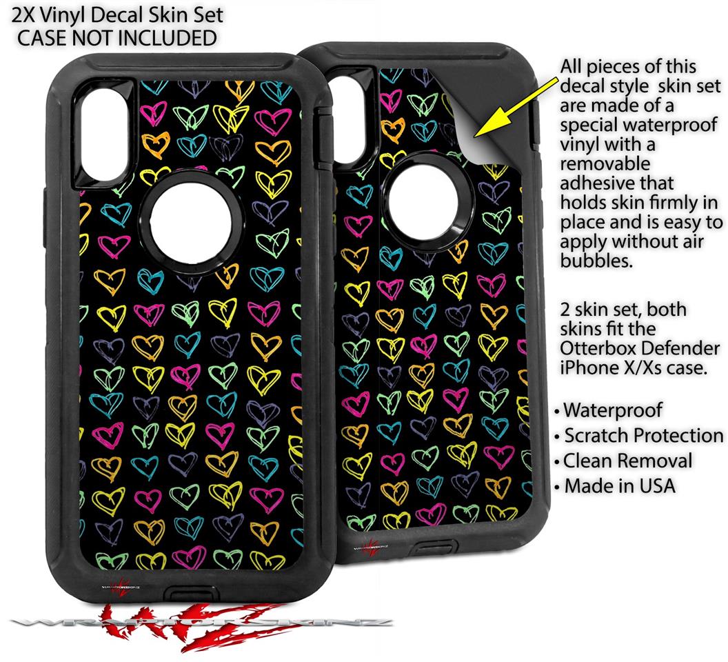 2x Decal style Skin Wrap Set compatible with Otterbox Defender iPhone X and Xs Case - Kearas Hearts Black (CASE NOT INCLUDED)
