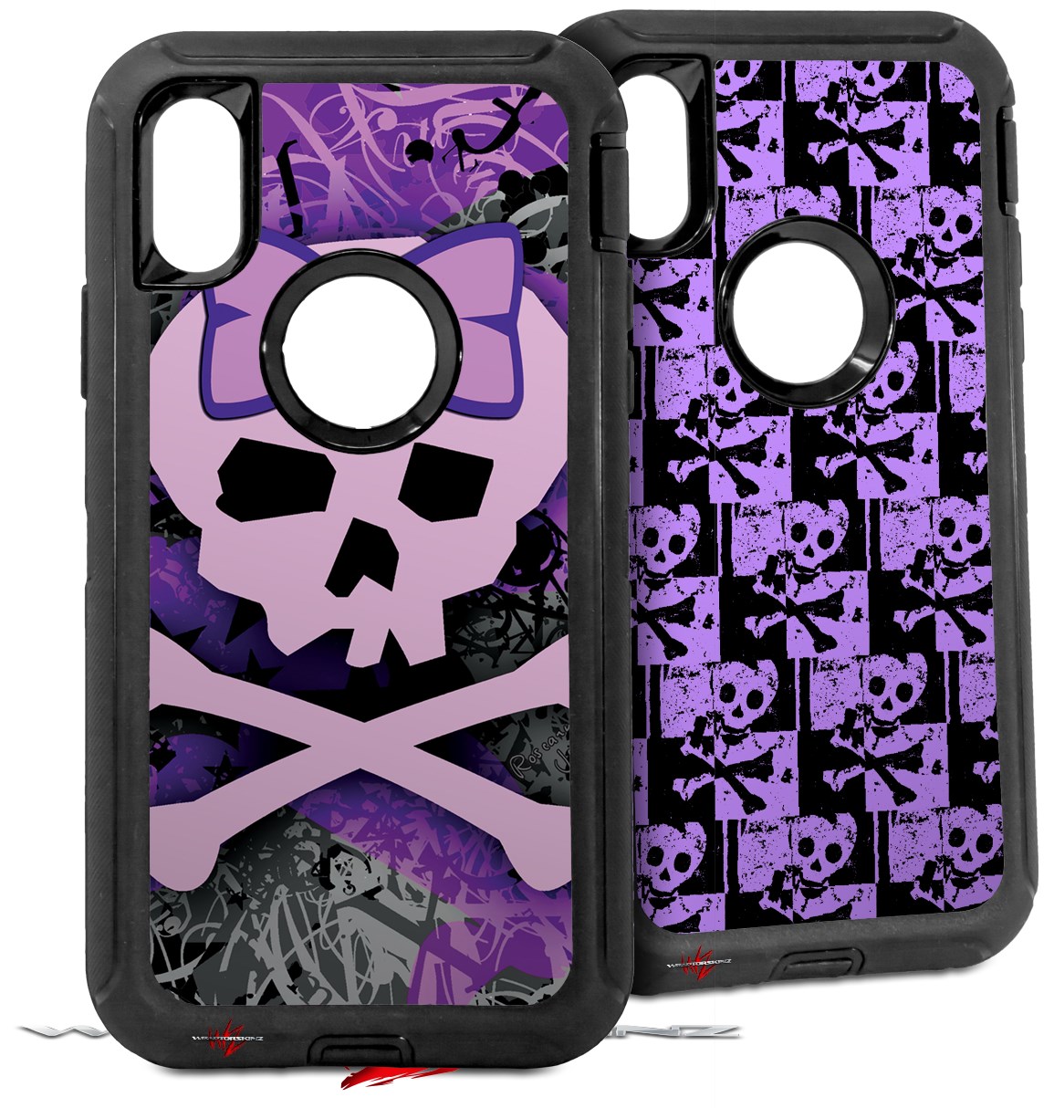 2x Decal style Skin Wrap Set compatible with Otterbox Defender iPhone X and Xs Case - Purple Girly Skull (CASE NOT INCLUDED)