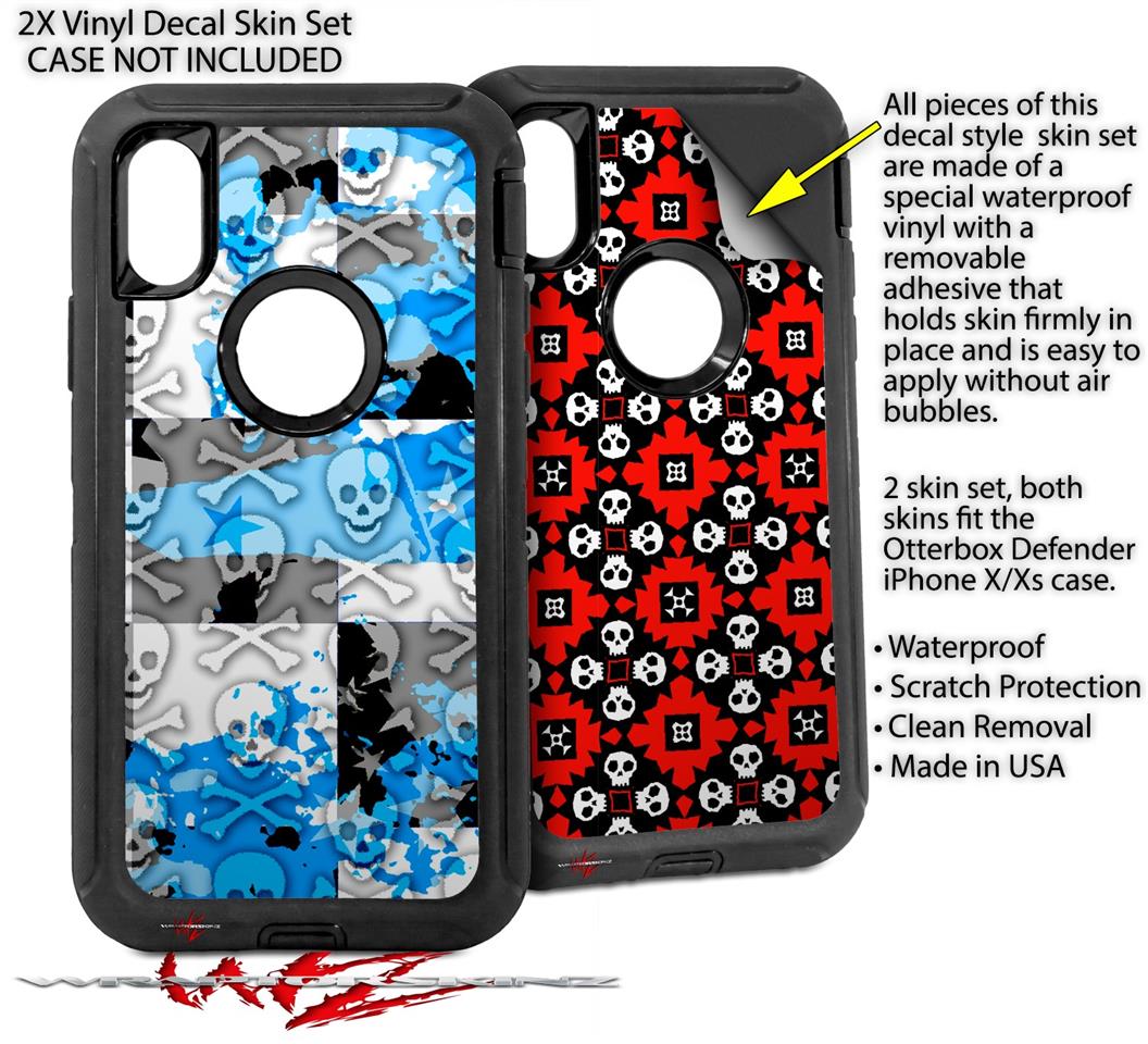 2x Decal style Skin Wrap Set compatible with Otterbox Defender iPhone X and Xs Case - Checker Skull Splatter Blue (CASE NOT INCLUDED)
