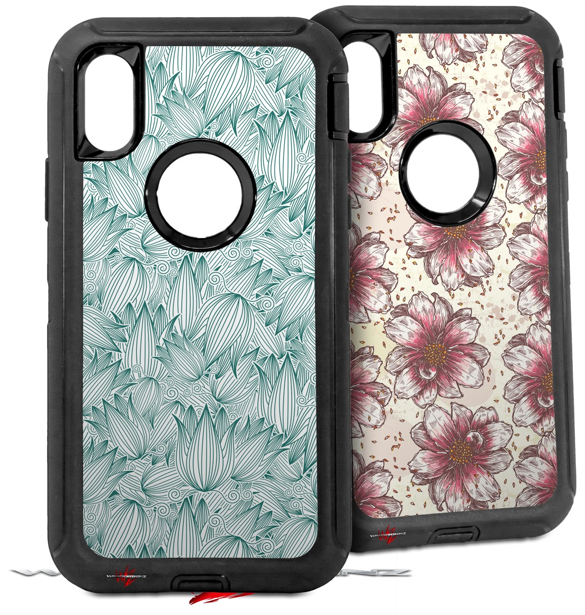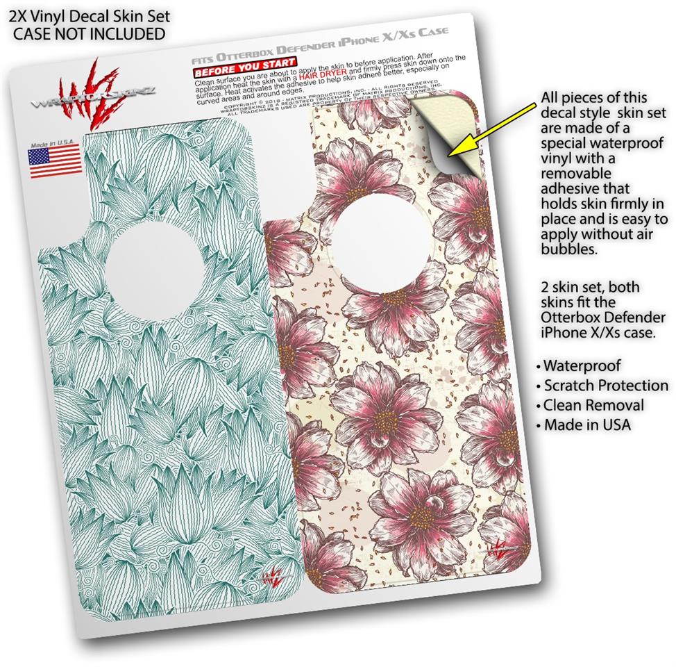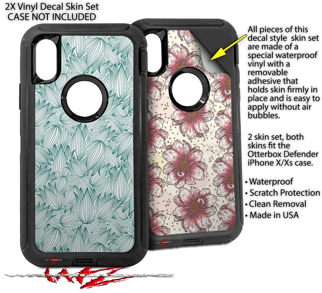 2x Decal style Skin Wrap Set compatible with Otterbox Defender iPhone X and Xs Case - Flowers Pattern 09 (CASE NOT INCLUDED)