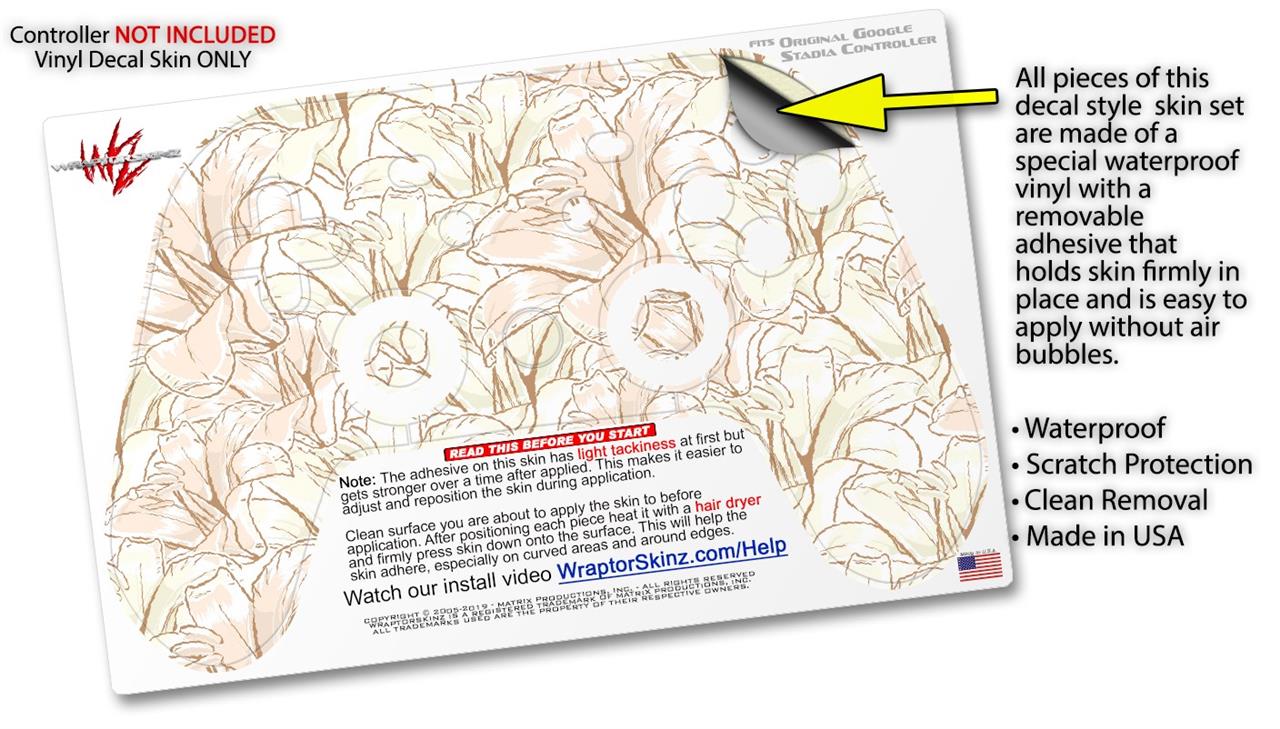 This product is in no way affiliated with or endorsed by Google. WraptorSkinz® skin wraps work with the Original Google Stadia version 1 Controller. Printed using superb photo quality designs and vibrant colors printed with special fade resistant inks that last even in direct sun for years. WraptorSkinz are a composite of two layers of commercial grade materials. The bottom layer is a soft, flexible vinyl with a special removable adhesive that is easily positioned, applied without air bubbles. Next, we print the bottom layer with UV protected, fade resistant inks that deliver superb photo quality designs in vibrant colors. Finally, we bond a professional grade laminate over the entire skin adding a glossy protective finish.