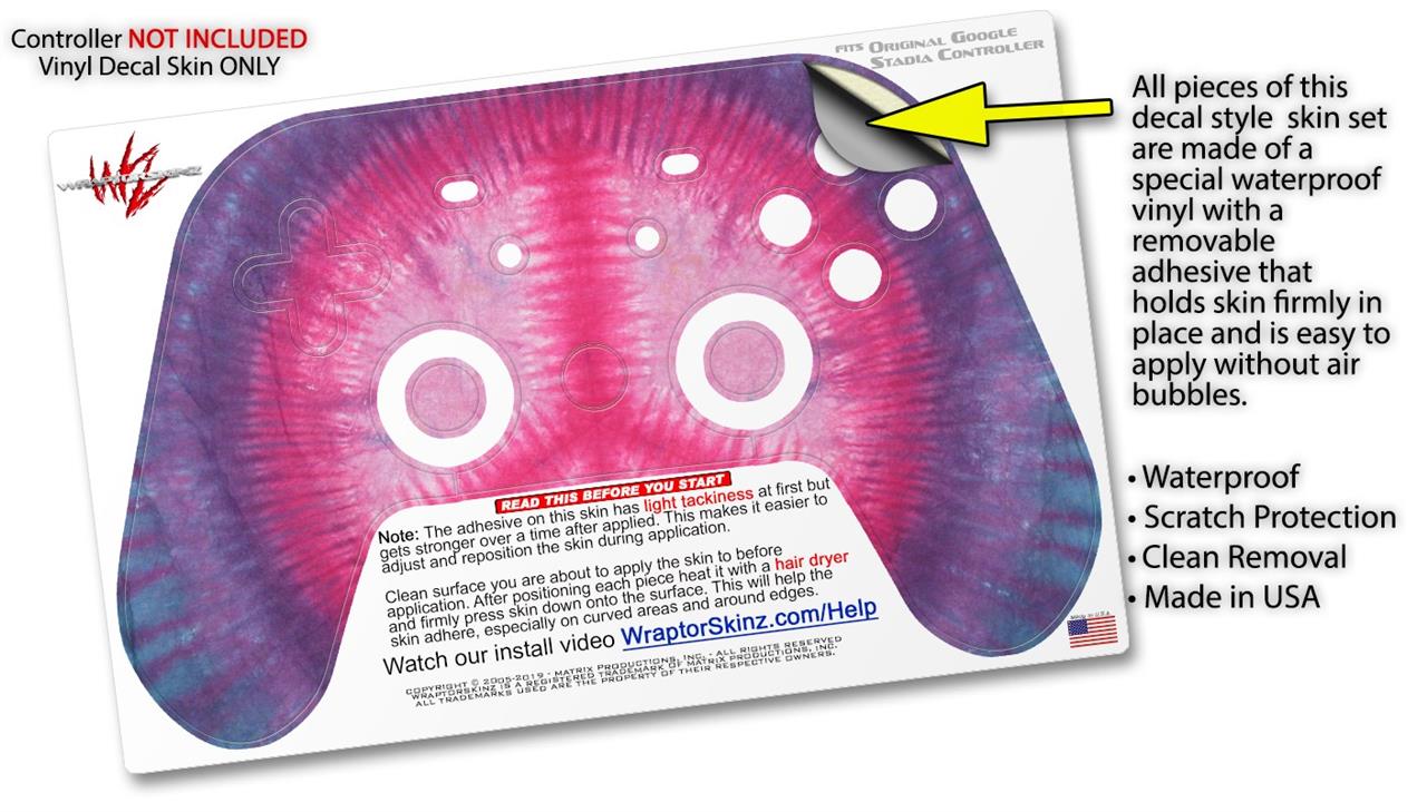 This product is in no way affiliated with or endorsed by Google. WraptorSkinz® skin wraps work with the Original Google Stadia version 1 Controller. Printed using superb photo quality designs and vibrant colors printed with special fade resistant inks that last even in direct sun for years. WraptorSkinz are a composite of two layers of commercial grade materials. The bottom layer is a soft, flexible vinyl with a special removable adhesive that is easily positioned, applied without air bubbles. Next, we print the bottom layer with UV protected, fade resistant inks that deliver superb photo quality designs in vibrant colors. Finally, we bond a professional grade laminate over the entire skin adding a glossy protective finish.