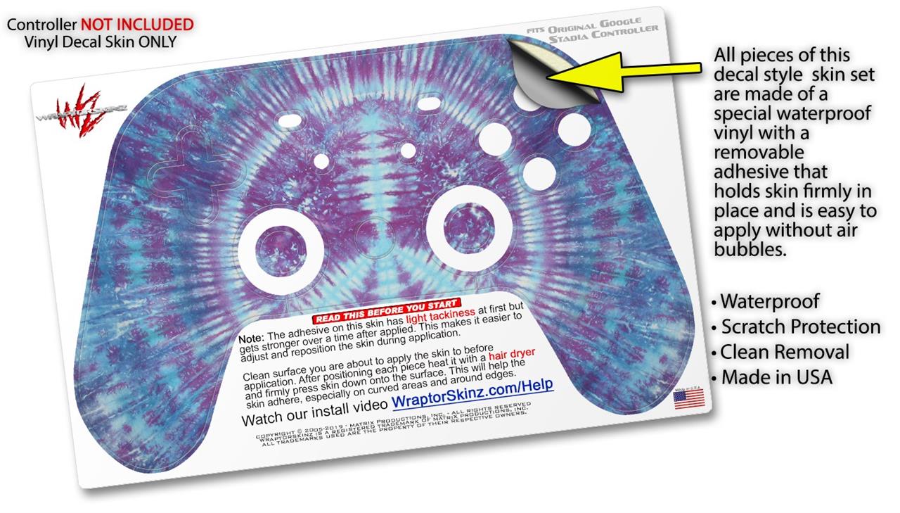 This product is in no way affiliated with or endorsed by Google. WraptorSkinz® skin wraps work with the Original Google Stadia version 1 Controller. Printed using superb photo quality designs and vibrant colors printed with special fade resistant inks that last even in direct sun for years. WraptorSkinz are a composite of two layers of commercial grade materials. The bottom layer is a soft, flexible vinyl with a special removable adhesive that is easily positioned, applied without air bubbles. Next, we print the bottom layer with UV protected, fade resistant inks that deliver superb photo quality designs in vibrant colors. Finally, we bond a professional grade laminate over the entire skin adding a glossy protective finish.