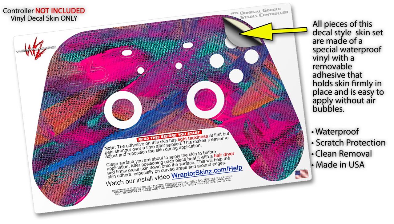 This product is in no way affiliated with or endorsed by Google. WraptorSkinz® skin wraps work with the Original Google Stadia version 1 Controller. Printed using superb photo quality designs and vibrant colors printed with special fade resistant inks that last even in direct sun for years. WraptorSkinz are a composite of two layers of commercial grade materials. The bottom layer is a soft, flexible vinyl with a special removable adhesive that is easily positioned, applied without air bubbles. Next, we print the bottom layer with UV protected, fade resistant inks that deliver superb photo quality designs in vibrant colors. Finally, we bond a professional grade laminate over the entire skin adding a glossy protective finish.