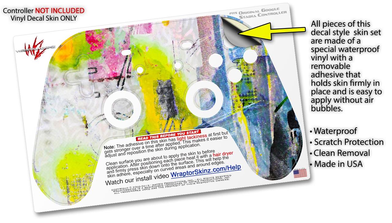 This product is in no way affiliated with or endorsed by Google. WraptorSkinz® skin wraps work with the Original Google Stadia version 1 Controller. Printed using superb photo quality designs and vibrant colors printed with special fade resistant inks that last even in direct sun for years. WraptorSkinz are a composite of two layers of commercial grade materials. The bottom layer is a soft, flexible vinyl with a special removable adhesive that is easily positioned, applied without air bubbles. Next, we print the bottom layer with UV protected, fade resistant inks that deliver superb photo quality designs in vibrant colors. Finally, we bond a professional grade laminate over the entire skin adding a glossy protective finish.