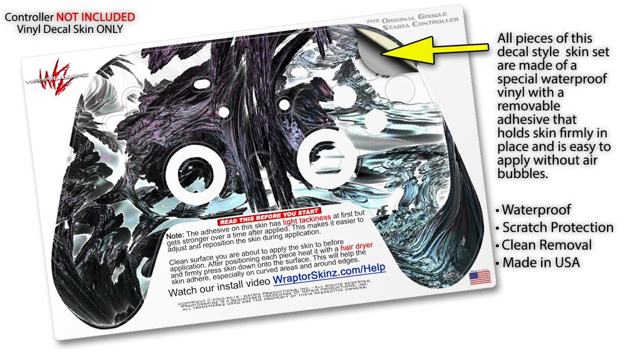 This product is in no way affiliated with or endorsed by Google. WraptorSkinz® skin wraps work with the Original Google Stadia version 1 Controller. Printed using superb photo quality designs and vibrant colors printed with special fade resistant inks that last even in direct sun for years. WraptorSkinz are a composite of two layers of commercial grade materials. The bottom layer is a soft, flexible vinyl with a special removable adhesive that is easily positioned, applied without air bubbles. Next, we print the bottom layer with UV protected, fade resistant inks that deliver superb photo quality designs in vibrant colors. Finally, we bond a professional grade laminate over the entire skin adding a glossy protective finish.