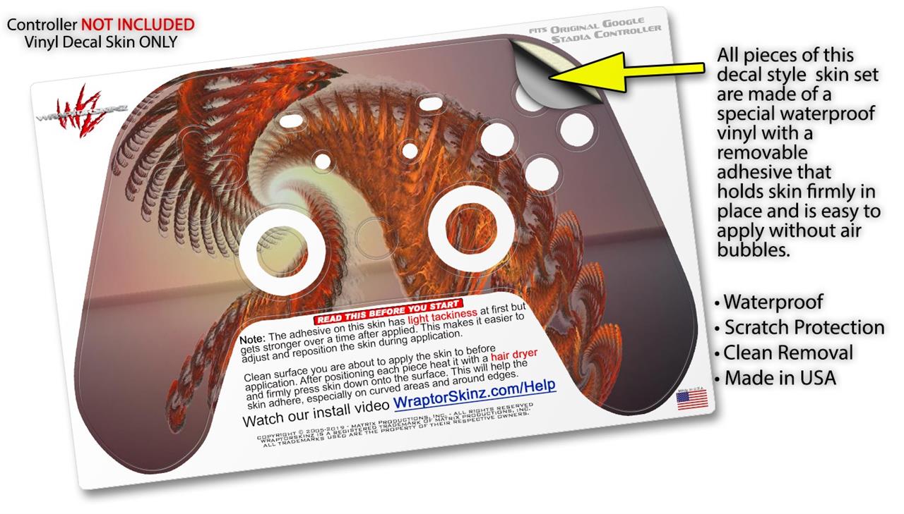 This product is in no way affiliated with or endorsed by Google. WraptorSkinz® skin wraps work with the Original Google Stadia version 1 Controller. Printed using superb photo quality designs and vibrant colors printed with special fade resistant inks that last even in direct sun for years. WraptorSkinz are a composite of two layers of commercial grade materials. The bottom layer is a soft, flexible vinyl with a special removable adhesive that is easily positioned, applied without air bubbles. Next, we print the bottom layer with UV protected, fade resistant inks that deliver superb photo quality designs in vibrant colors. Finally, we bond a professional grade laminate over the entire skin adding a glossy protective finish.