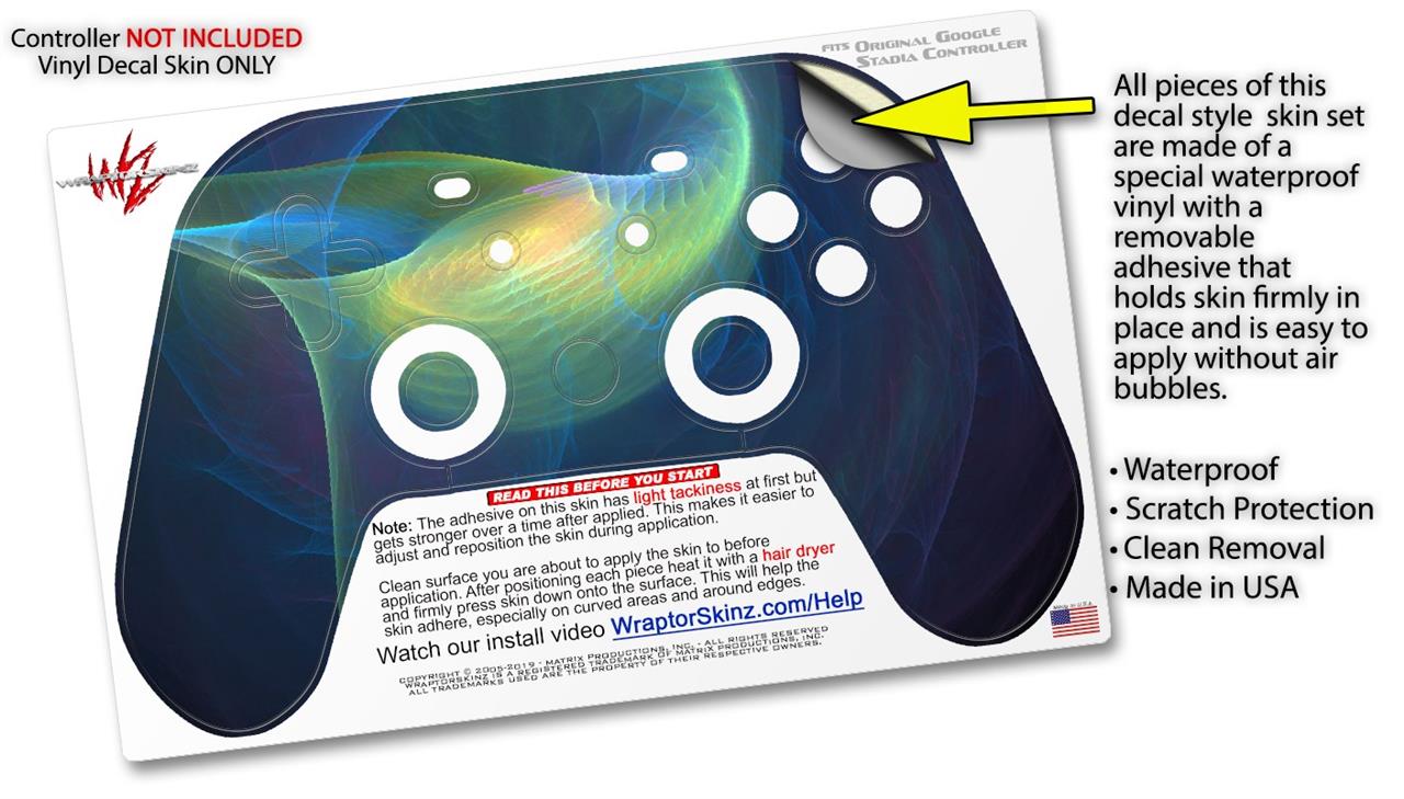 This product is in no way affiliated with or endorsed by Google. WraptorSkinz® skin wraps work with the Original Google Stadia version 1 Controller. Printed using superb photo quality designs and vibrant colors printed with special fade resistant inks that last even in direct sun for years. WraptorSkinz are a composite of two layers of commercial grade materials. The bottom layer is a soft, flexible vinyl with a special removable adhesive that is easily positioned, applied without air bubbles. Next, we print the bottom layer with UV protected, fade resistant inks that deliver superb photo quality designs in vibrant colors. Finally, we bond a professional grade laminate over the entire skin adding a glossy protective finish.