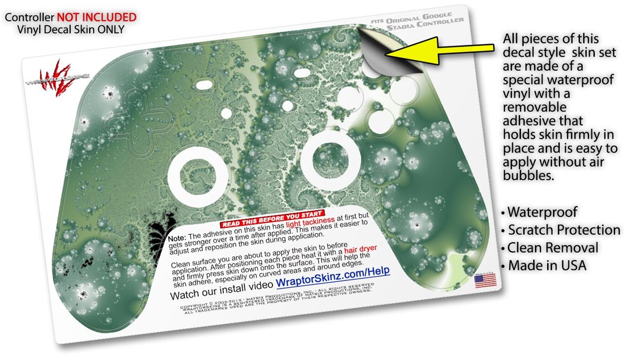This product is in no way affiliated with or endorsed by Google. WraptorSkinz® skin wraps work with the Original Google Stadia version 1 Controller. Printed using superb photo quality designs and vibrant colors printed with special fade resistant inks that last even in direct sun for years. WraptorSkinz are a composite of two layers of commercial grade materials. The bottom layer is a soft, flexible vinyl with a special removable adhesive that is easily positioned, applied without air bubbles. Next, we print the bottom layer with UV protected, fade resistant inks that deliver superb photo quality designs in vibrant colors. Finally, we bond a professional grade laminate over the entire skin adding a glossy protective finish.