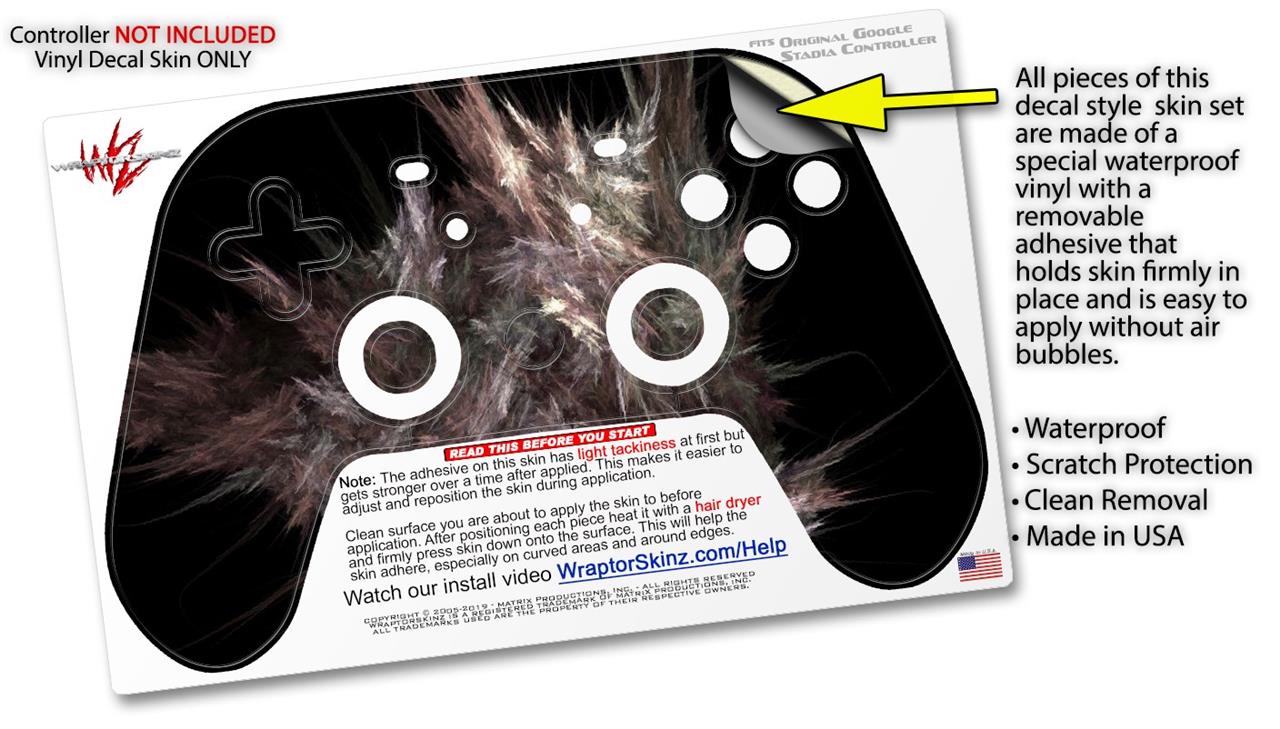 This product is in no way affiliated with or endorsed by Google. WraptorSkinz® skin wraps work with the Original Google Stadia version 1 Controller. Printed using superb photo quality designs and vibrant colors printed with special fade resistant inks that last even in direct sun for years. WraptorSkinz are a composite of two layers of commercial grade materials. The bottom layer is a soft, flexible vinyl with a special removable adhesive that is easily positioned, applied without air bubbles. Next, we print the bottom layer with UV protected, fade resistant inks that deliver superb photo quality designs in vibrant colors. Finally, we bond a professional grade laminate over the entire skin adding a glossy protective finish.