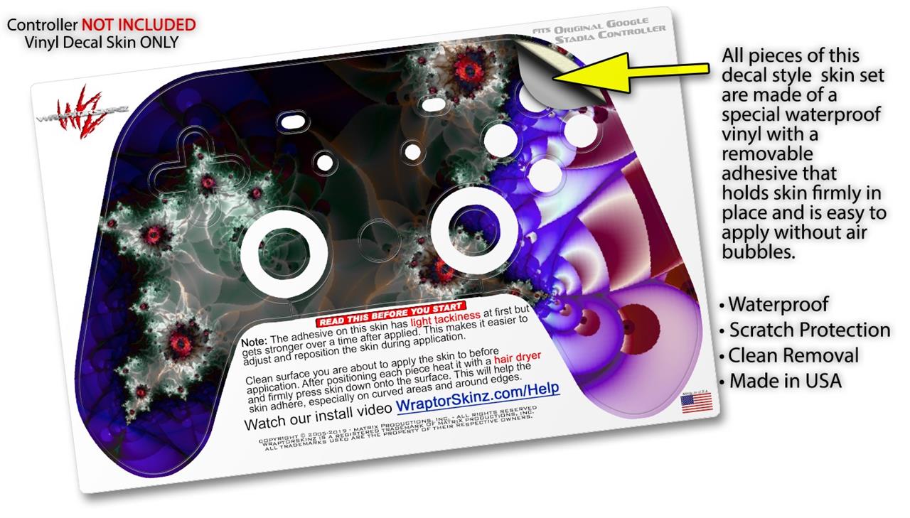 This product is in no way affiliated with or endorsed by Google. WraptorSkinz® skin wraps work with the Original Google Stadia version 1 Controller. Printed using superb photo quality designs and vibrant colors printed with special fade resistant inks that last even in direct sun for years. WraptorSkinz are a composite of two layers of commercial grade materials. The bottom layer is a soft, flexible vinyl with a special removable adhesive that is easily positioned, applied without air bubbles. Next, we print the bottom layer with UV protected, fade resistant inks that deliver superb photo quality designs in vibrant colors. Finally, we bond a professional grade laminate over the entire skin adding a glossy protective finish.