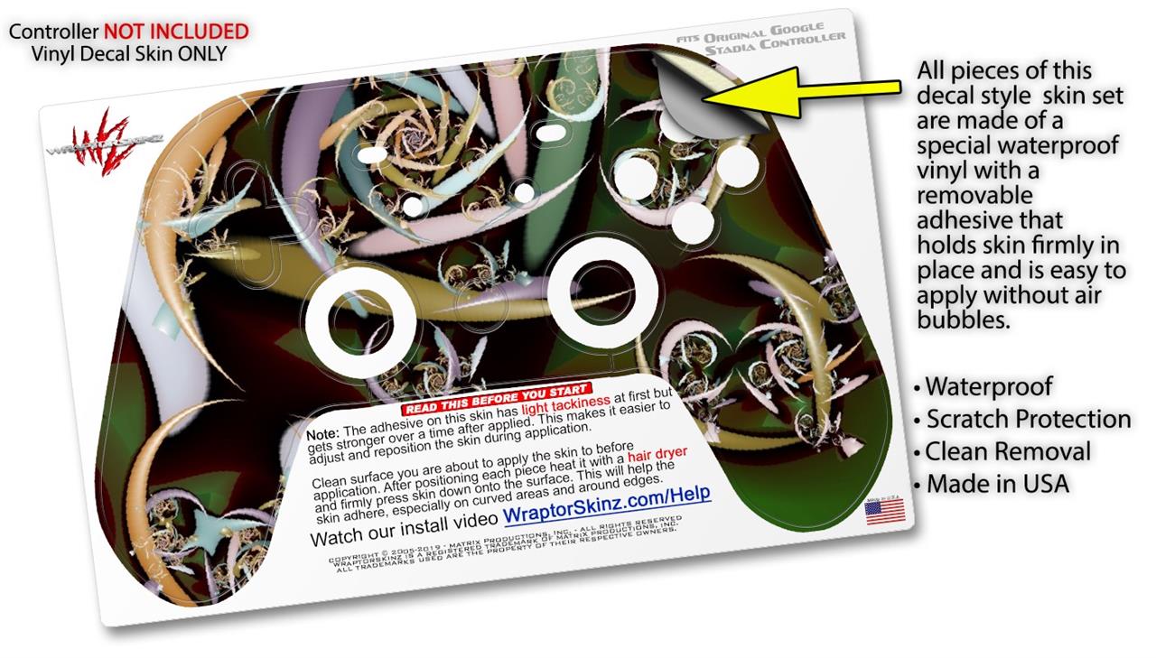 This product is in no way affiliated with or endorsed by Google. WraptorSkinz® skin wraps work with the Original Google Stadia version 1 Controller. Printed using superb photo quality designs and vibrant colors printed with special fade resistant inks that last even in direct sun for years. WraptorSkinz are a composite of two layers of commercial grade materials. The bottom layer is a soft, flexible vinyl with a special removable adhesive that is easily positioned, applied without air bubbles. Next, we print the bottom layer with UV protected, fade resistant inks that deliver superb photo quality designs in vibrant colors. Finally, we bond a professional grade laminate over the entire skin adding a glossy protective finish.