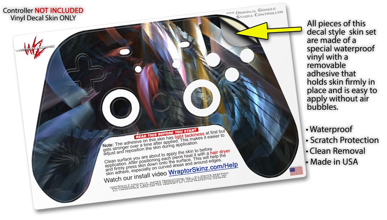 This product is in no way affiliated with or endorsed by Google. WraptorSkinz® skin wraps work with the Original Google Stadia version 1 Controller. Printed using superb photo quality designs and vibrant colors printed with special fade resistant inks that last even in direct sun for years. WraptorSkinz are a composite of two layers of commercial grade materials. The bottom layer is a soft, flexible vinyl with a special removable adhesive that is easily positioned, applied without air bubbles. Next, we print the bottom layer with UV protected, fade resistant inks that deliver superb photo quality designs in vibrant colors. Finally, we bond a professional grade laminate over the entire skin adding a glossy protective finish.