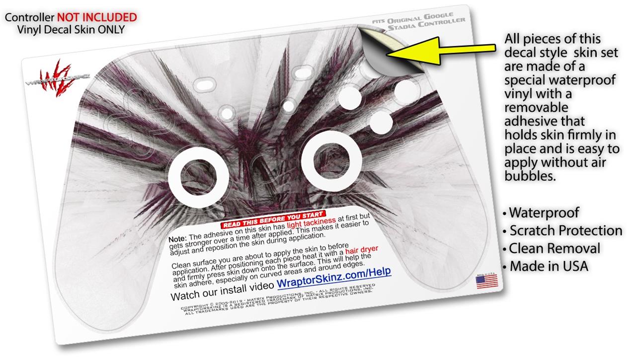 This product is in no way affiliated with or endorsed by Google. WraptorSkinz® skin wraps work with the Original Google Stadia version 1 Controller. Printed using superb photo quality designs and vibrant colors printed with special fade resistant inks that last even in direct sun for years. WraptorSkinz are a composite of two layers of commercial grade materials. The bottom layer is a soft, flexible vinyl with a special removable adhesive that is easily positioned, applied without air bubbles. Next, we print the bottom layer with UV protected, fade resistant inks that deliver superb photo quality designs in vibrant colors. Finally, we bond a professional grade laminate over the entire skin adding a glossy protective finish.