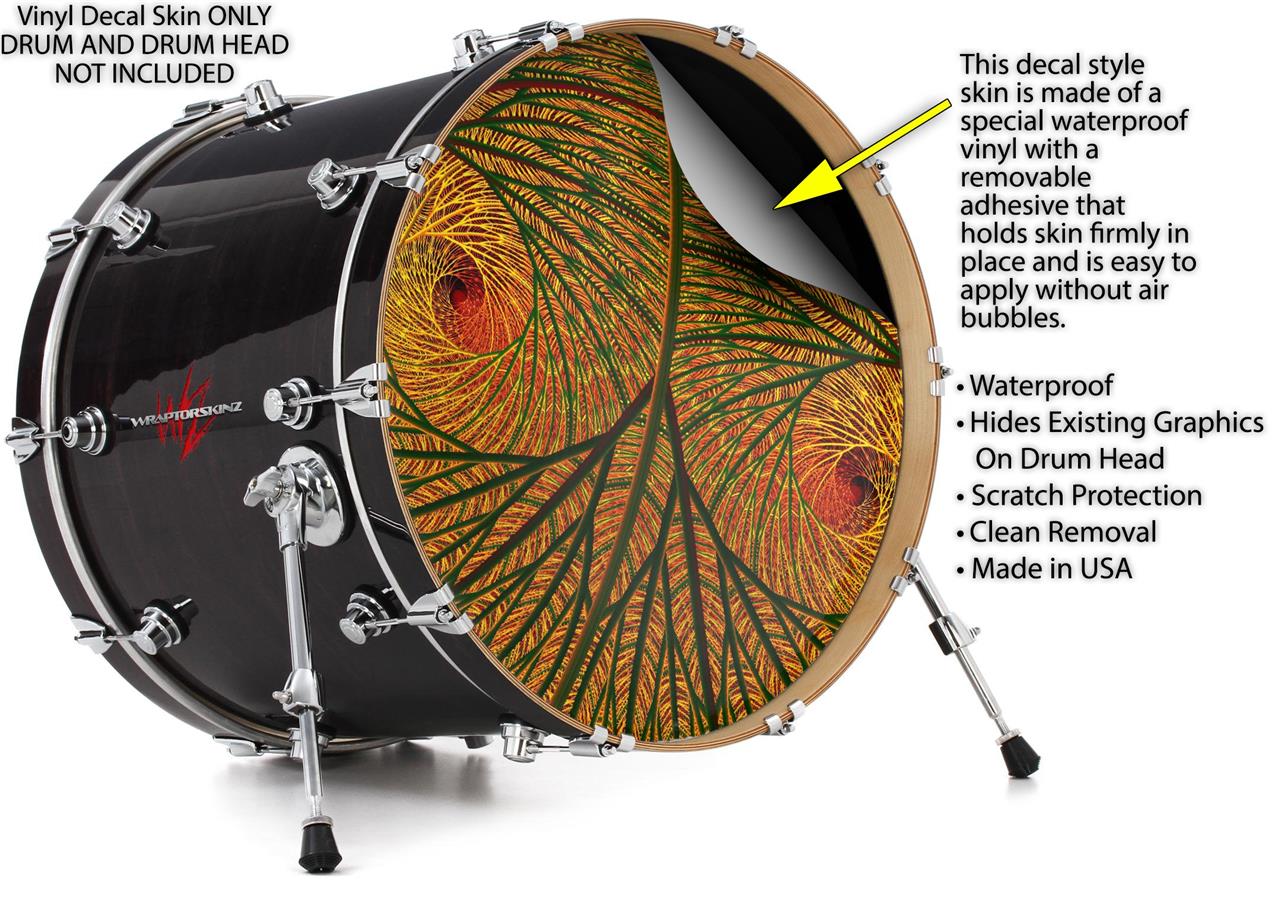 This design also available in other sizes. WraptorSkinz® skin wraps compatible with most kick drum heads. Printed using superb photo quality designs and vibrant colors printed with special fade resistant inks that last even in direct sun for years. WraptorSkinz are a composite three layer commercial grade materials vinyl. The bottom layer is a air release, grey block out removable adhesive that hides existing graphics on the drum head and is easily applied without air bubbles. The middle layer is a flexible vinyl printed with UV protected, fade resistant inks that deliver superb photo quality designs in vibrant colors. Finally, we bond a professional grade laminate over the entire skin adding a glossy protective finish.