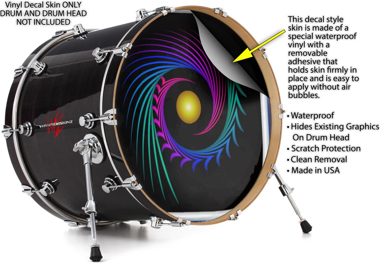 This design also available in other sizes. WraptorSkinz® skin wraps compatible with most kick drum heads. Printed using superb photo quality designs and vibrant colors printed with special fade resistant inks that last even in direct sun for years. WraptorSkinz are a composite three layer commercial grade materials vinyl. The bottom layer is a air release, grey block out removable adhesive that hides existing graphics on the drum head and is easily applied without air bubbles. The middle layer is a flexible vinyl printed with UV protected, fade resistant inks that deliver superb photo quality designs in vibrant colors. Finally, we bond a professional grade laminate over the entire skin adding a glossy protective finish.