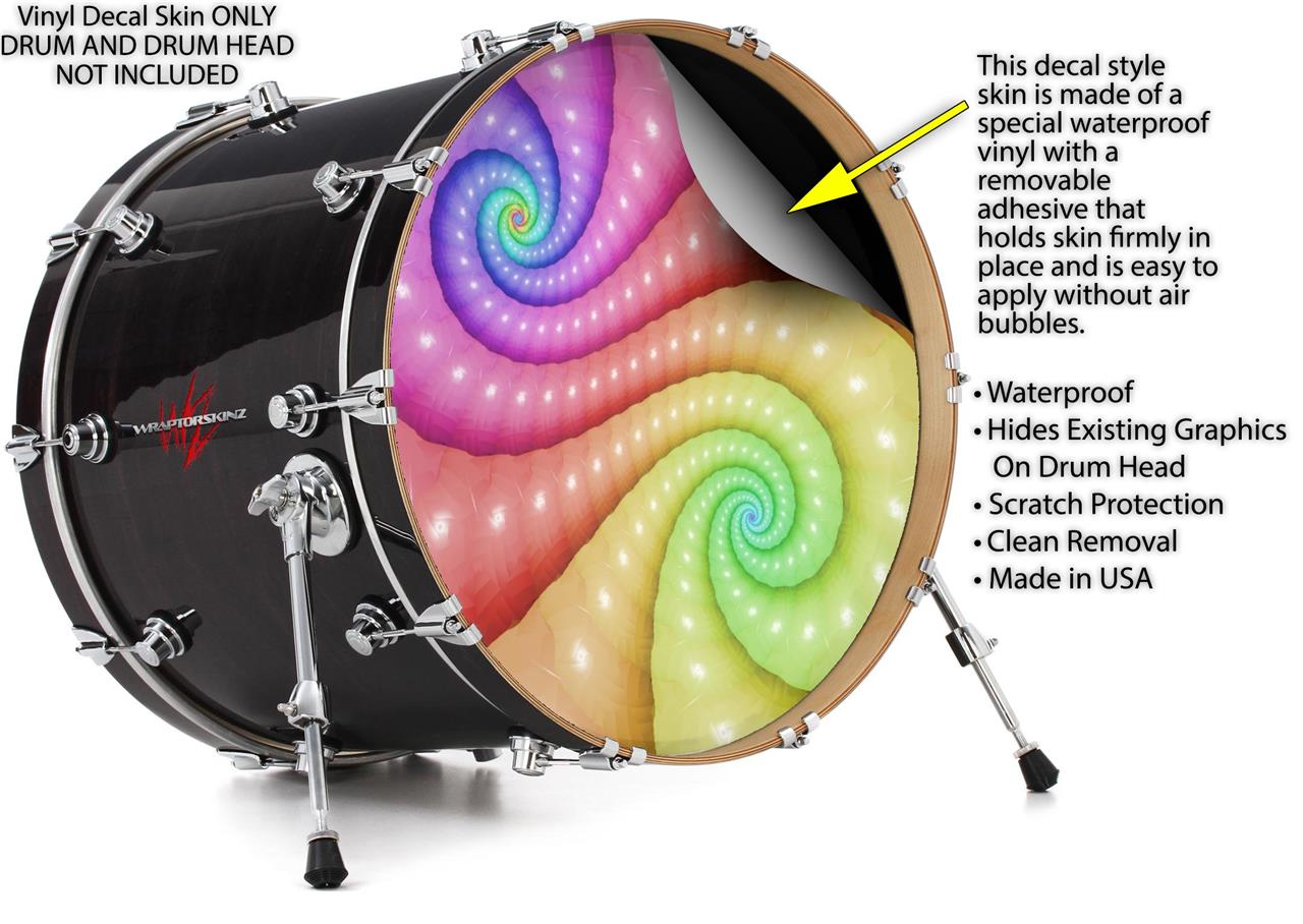 This design also available in other sizes. WraptorSkinz® skin wraps compatible with most kick drum heads. Printed using superb photo quality designs and vibrant colors printed with special fade resistant inks that last even in direct sun for years. WraptorSkinz are a composite three layer commercial grade materials vinyl. The bottom layer is a air release, grey block out removable adhesive that hides existing graphics on the drum head and is easily applied without air bubbles. The middle layer is a flexible vinyl printed with UV protected, fade resistant inks that deliver superb photo quality designs in vibrant colors. Finally, we bond a professional grade laminate over the entire skin adding a glossy protective finish.