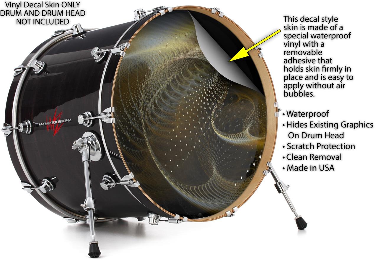 This design also available in other sizes. WraptorSkinz® skin wraps compatible with most kick drum heads. Printed using superb photo quality designs and vibrant colors printed with special fade resistant inks that last even in direct sun for years. WraptorSkinz are a composite three layer commercial grade materials vinyl. The bottom layer is a air release, grey block out removable adhesive that hides existing graphics on the drum head and is easily applied without air bubbles. The middle layer is a flexible vinyl printed with UV protected, fade resistant inks that deliver superb photo quality designs in vibrant colors. Finally, we bond a professional grade laminate over the entire skin adding a glossy protective finish.
