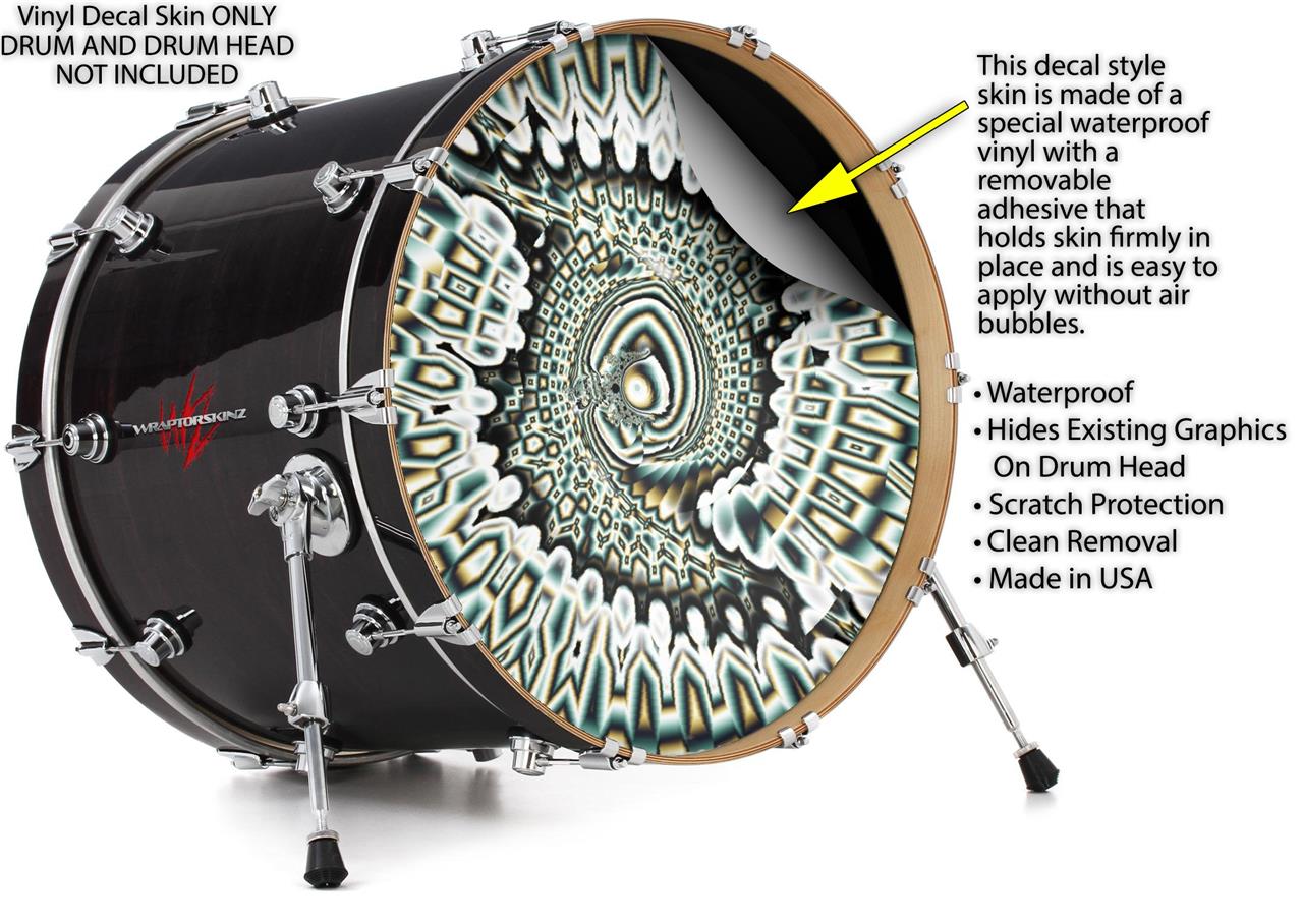 This design also available in other sizes. WraptorSkinz® skin wraps compatible with most kick drum heads. Printed using superb photo quality designs and vibrant colors printed with special fade resistant inks that last even in direct sun for years. WraptorSkinz are a composite three layer commercial grade materials vinyl. The bottom layer is a air release, grey block out removable adhesive that hides existing graphics on the drum head and is easily applied without air bubbles. The middle layer is a flexible vinyl printed with UV protected, fade resistant inks that deliver superb photo quality designs in vibrant colors. Finally, we bond a professional grade laminate over the entire skin adding a glossy protective finish.
