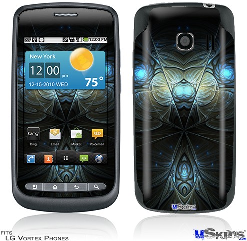Skin covers front and back of LG Vortex cell phone.