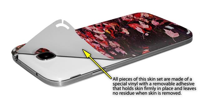• Decal style vinyl skin covers front and back of Samsung Galaxy S4 phone.