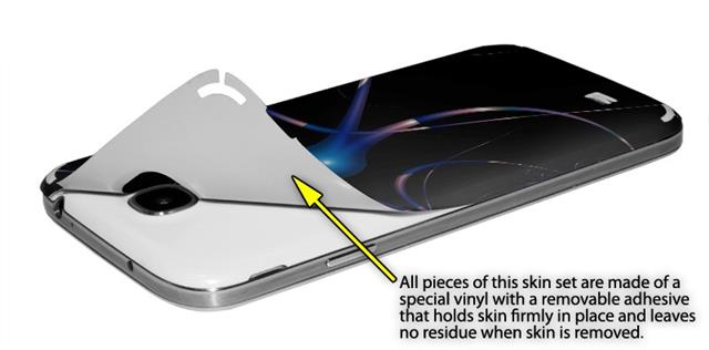 • Decal style vinyl skin covers front and back of Samsung Galaxy S4 phone.