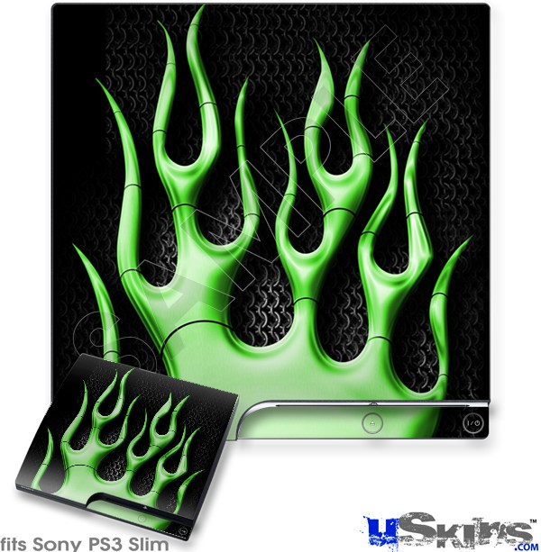 Decal Skin compatible with Sony PS3 Slim Metal Flames Green
