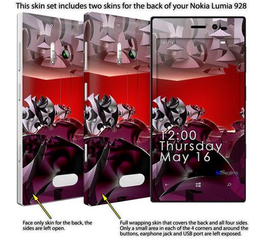 • Decal style vinyl skin covers front, back and side of Nokia Lumia 928 phone.