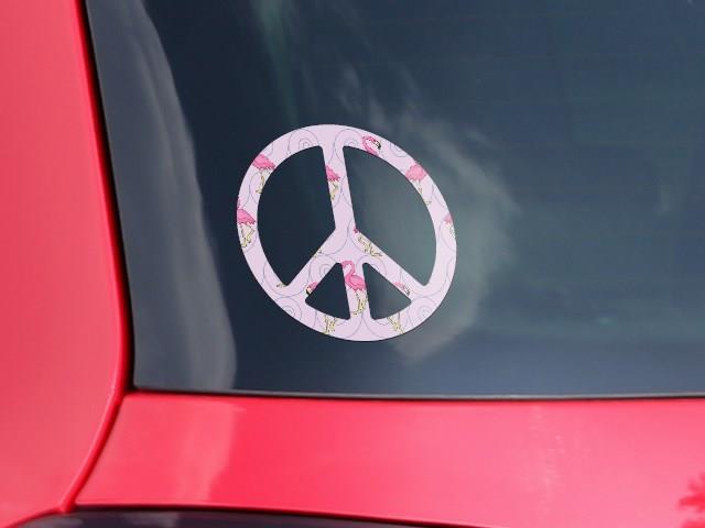 Flamingos on Pink - Peace Sign Car Window Decal 6 x 6 inches