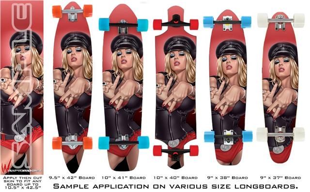 Our longboard skins are made so that one size fits boards up to 10” wide x 42” long. This means after applying the skin it you will trimming to fit you’re the shape of your board with a sharp utility knife.